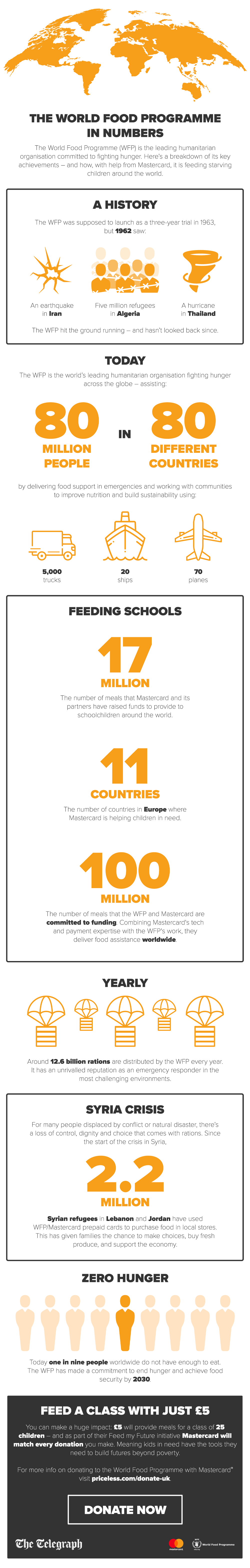 InfographicIn a bid to help the World Food Programme (WFP) achieve their aim of ending world hunger, Mastercard collaborated with the organisation to help raise funds and provide the technology needed to provide vital food assistance and help people in need. This infographic shows how the WFP continues to deliver food assistance in emergencies.