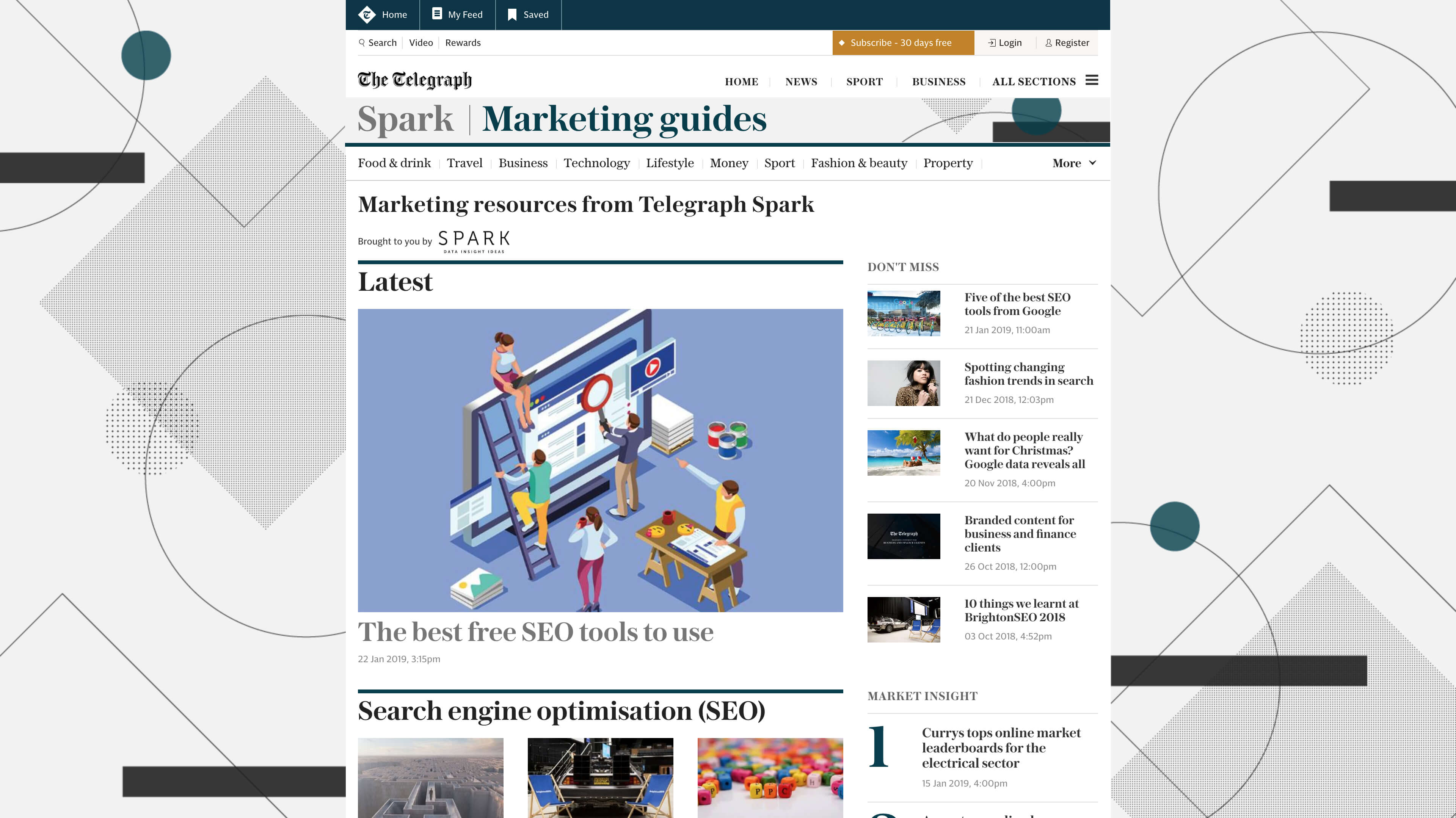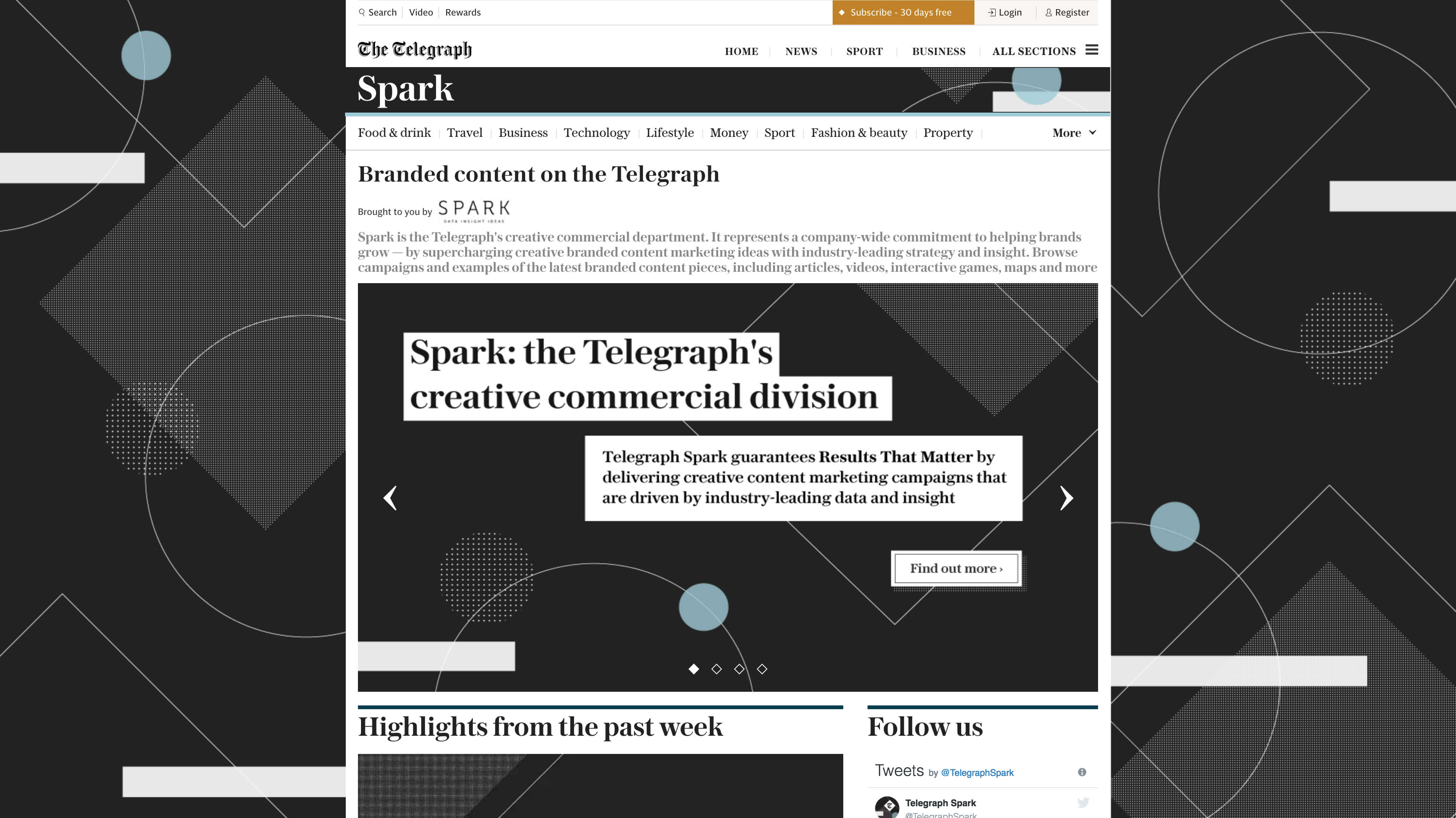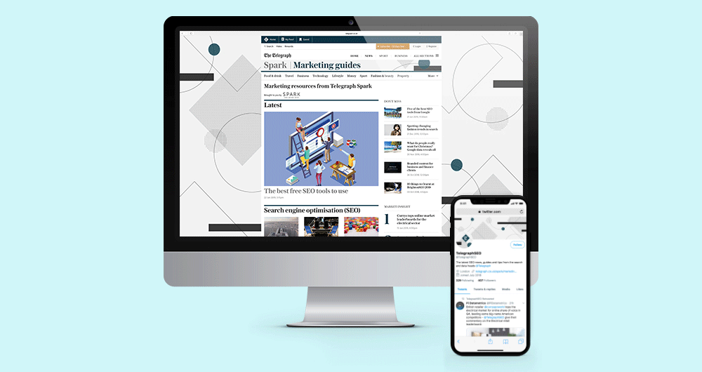 Spark's hub Spark SEO's hubThe brief was to create a fresh brand identity for Telegraph Spark's branded content hub and marketing/SEO's hub. The creative was to be used across the two Twitter accounts and internal comms including a new Google Slides template for the SEO team. Over the course of two weeks I carried out design development and pitched to senior staff a variety of routes. The outcome was abstract and based off a modern twist of the Bauhaus movement.