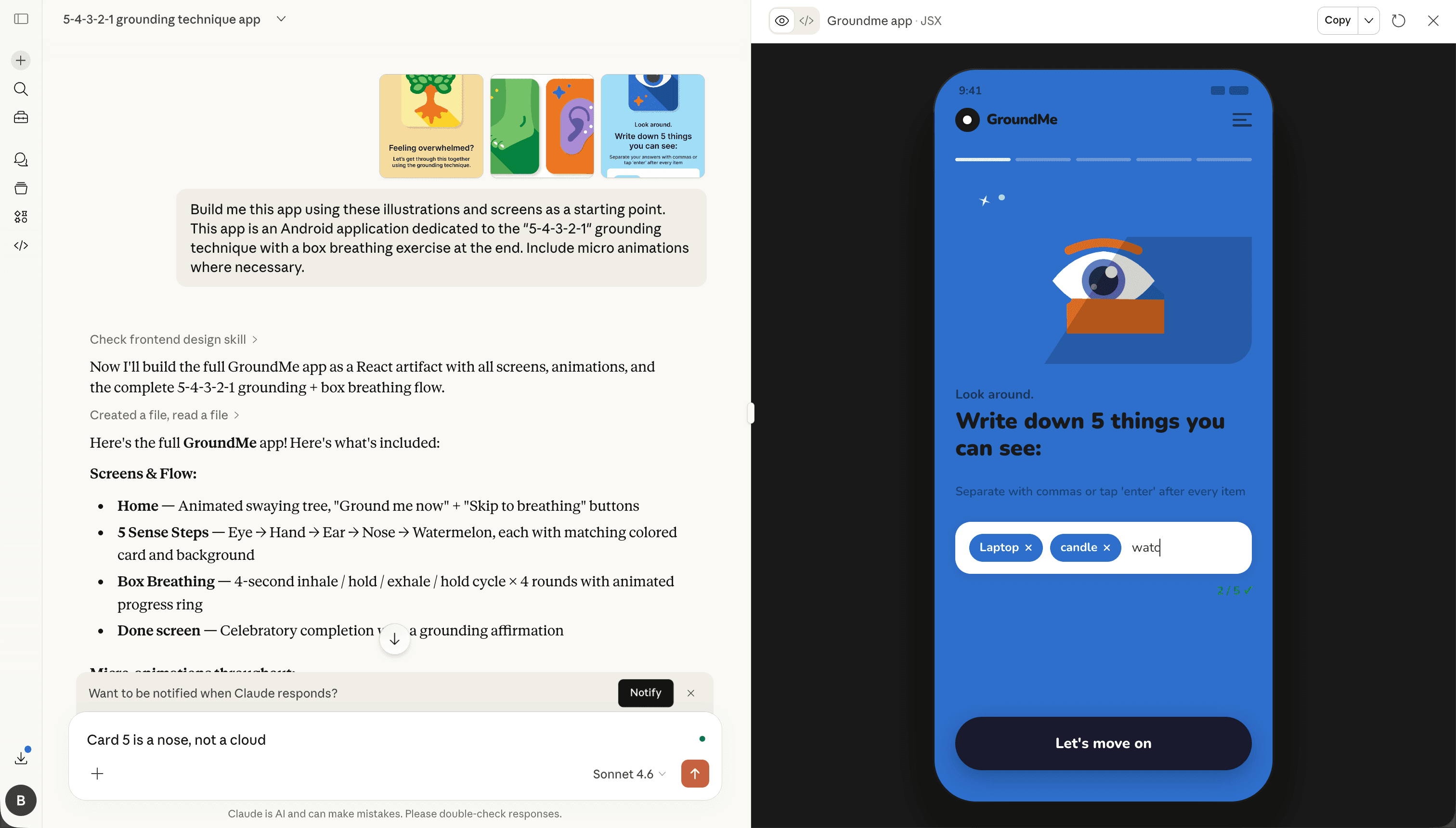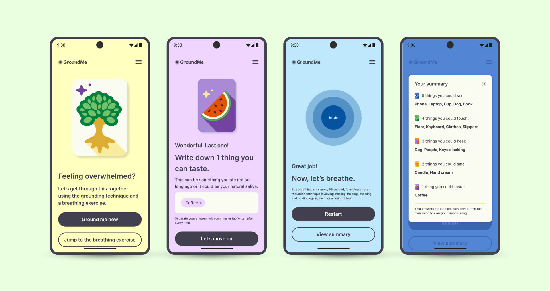 Driven by a personal mission to better manage panic attacks, I developed GroundMe, an Android application dedicated to the "5-4-3-2-1" grounding technique. What began as an experimental collaboration with Gemini quickly evolved into a rigorous design and development journey, where I learned to navigate Android Studio and decipher Kotlin to build a semi-functional, empathetic tool from scratch. Taking aesthetic cues from the calming world of Headspace, I integrated soft, mindful illustrations from Weavy to create an interface that feels like a supportive companion. This project has now transcended its "one-off" origins; I am currently refining the entire UI/UX and building a bespoke brand identity with original illustrations to turn this vision into a fully-fledged, professional-grade digital product.